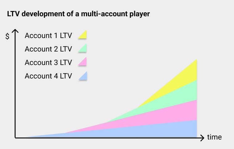 You have a single player owning several accounts, but they are increasing LTV on each account, not only one where their progress has stalled. Stacked LTV is a reality.