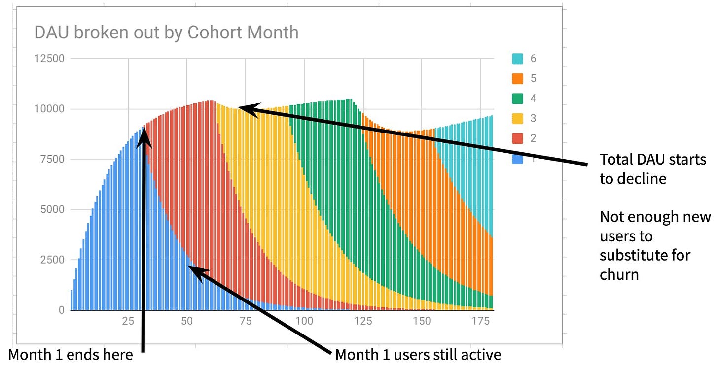 Suddenly, on Day 60, you only have a few percentage points of players playing. You never achieve DAU stacking, where you have countless cohorts of players playing indefinitely.