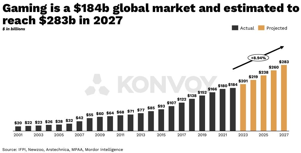 In Q1 of 2023, Konvoy Ventures did a great piece on the state of gaming. Here's the y-o-y chart.