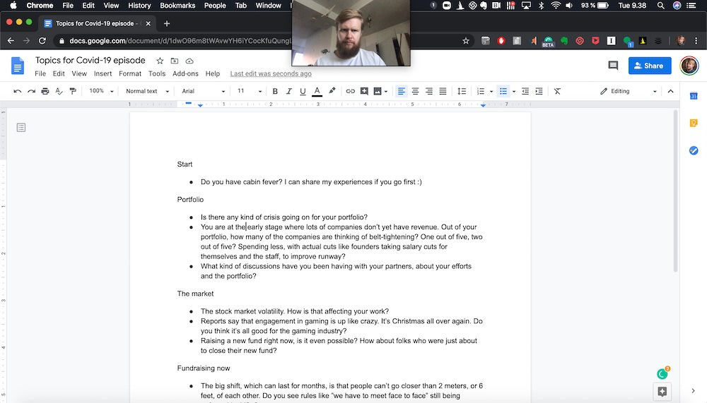 Network: If the video is lagging or there are sound quality issues, it will make the conversation harder. So please try to have a great set up to do these calls in. The worst calls I’ve been on are ones with tons of background noise, video, and audio lag, not being able to parse what people are saying and distracting stuff going on on the founder’s side. Worst, all of these things happening at once.