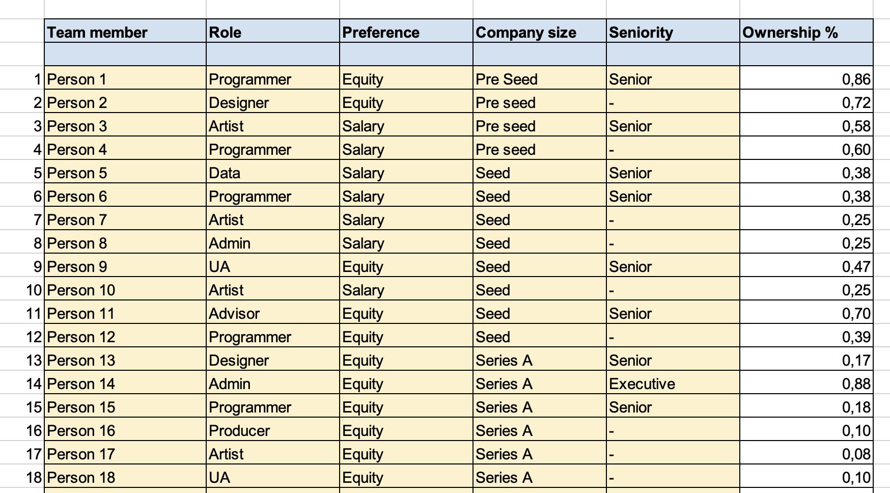 For this tool, we looked at examples in gaming; the stock options guide created by Index Venture and Buffer’s Open Equity calculator. We ended up using a hybrid. To make things clear, we created two example companies with allocations modeled out.